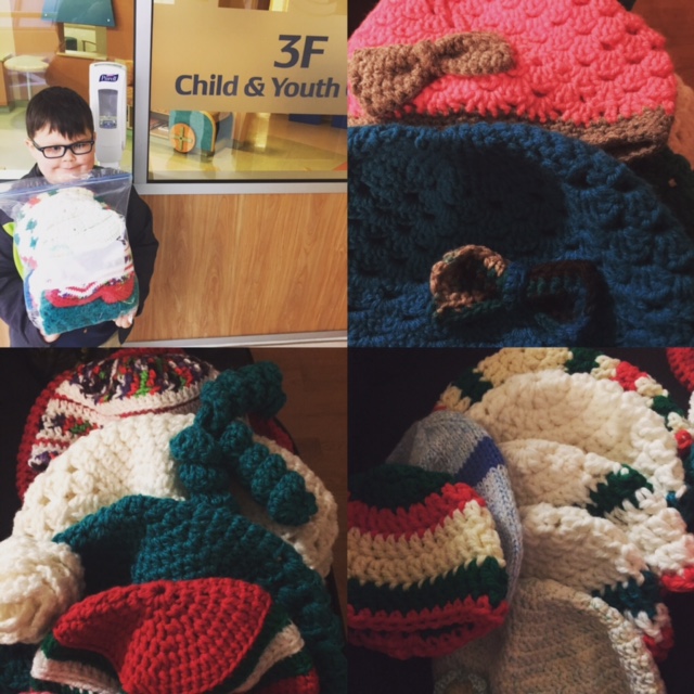 Now, a year later, I am a full blown crochet addict! And proud of it! I have started a crochet group in my hometown as people from all walks of life gather to gab and learn. My stress is pretty much nonexistent now as I know my hook and yarn will be there for me. If I’m feeling anxious at the doctor’s office? I whip out the good ol’ yarn bag. People young and old ask me what I’m doing, what I’m making, I make friends wherever I go! It opens up the line of communication and brings awareness to childhood cancer as I tell them I’m making chemo hats for the kids.